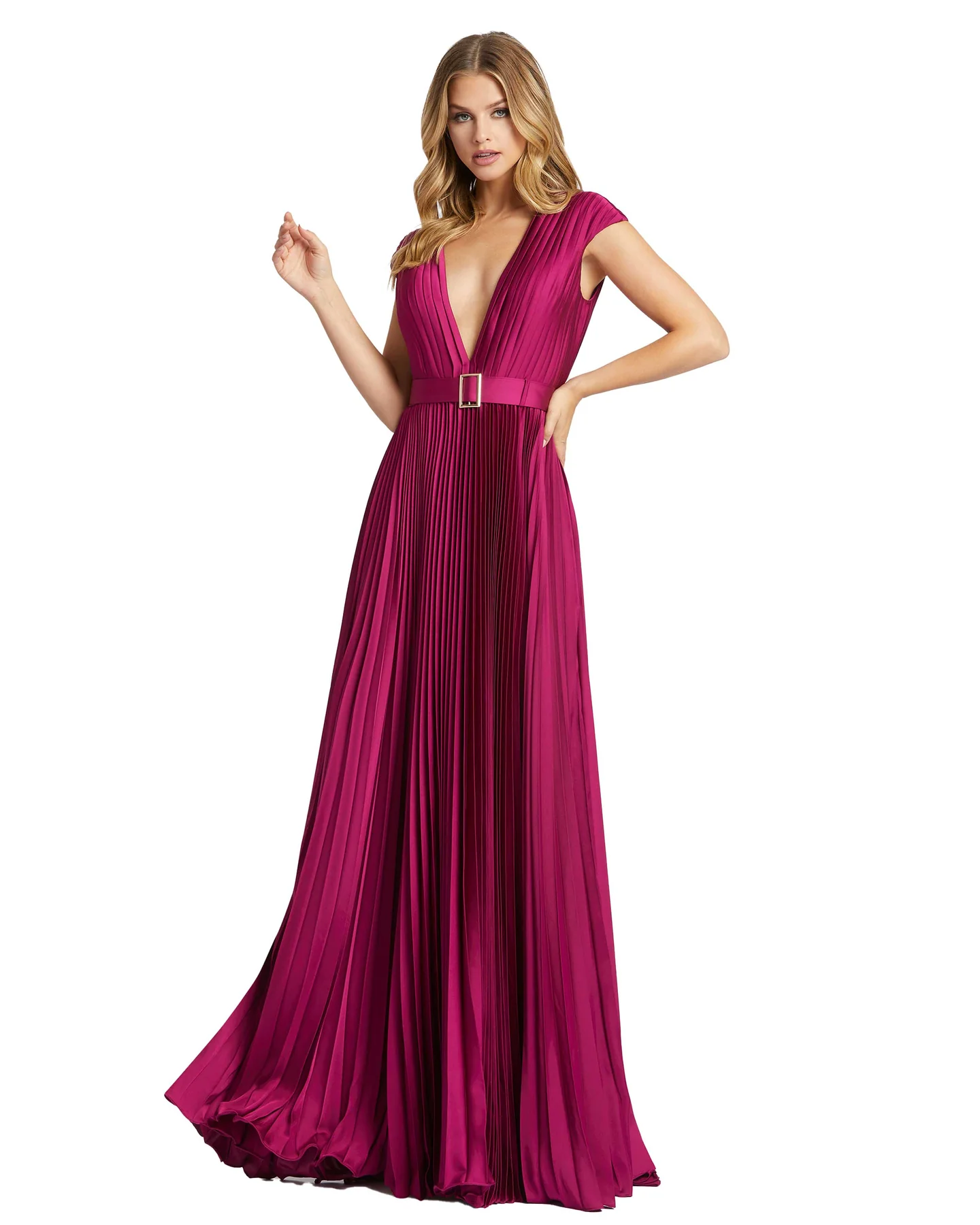 PLEATED PLUNGE NECK BELTED SATIN GOWN