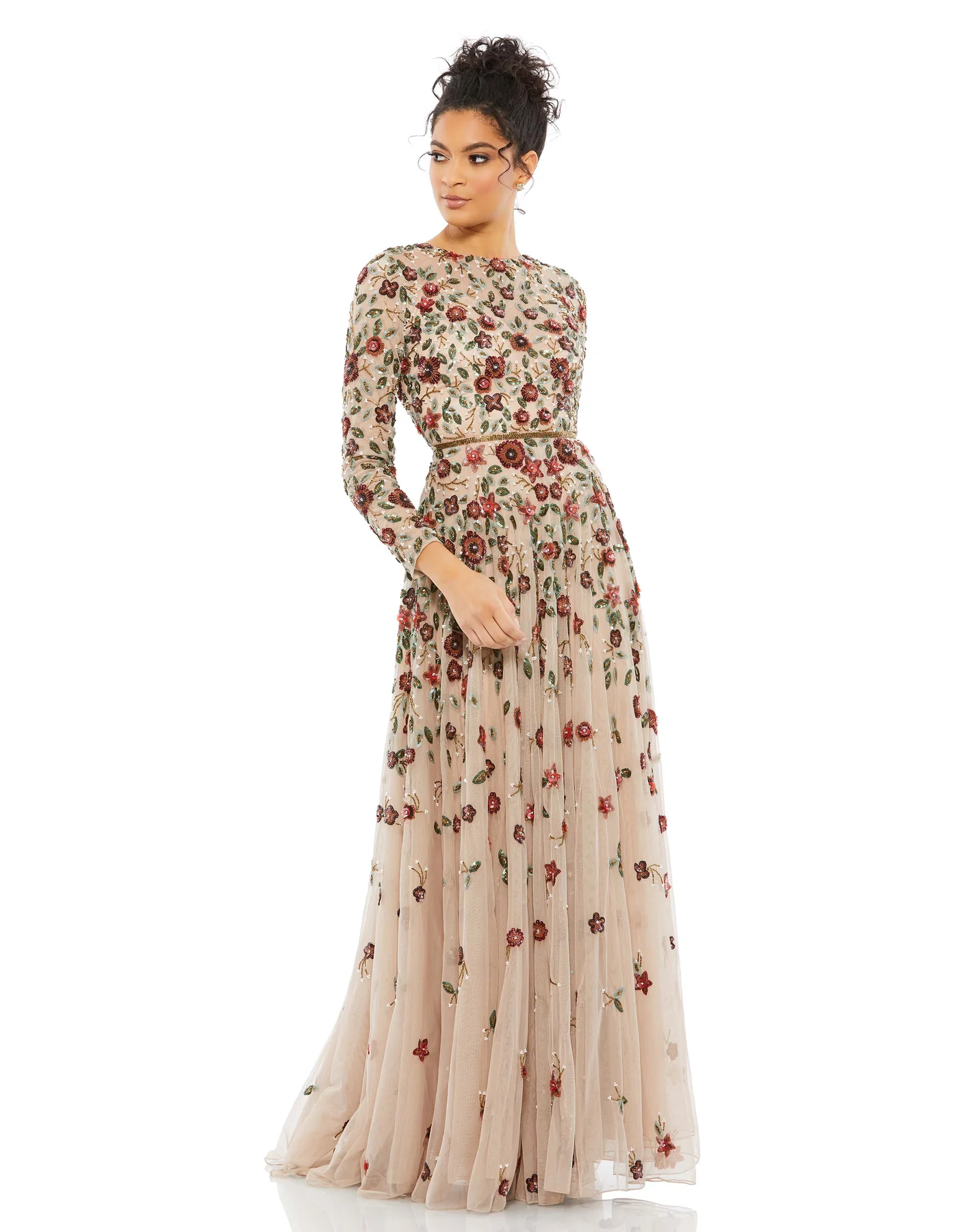 EMBELLISHED HIGH NECK LONG SLEEVE A LINE GOWN