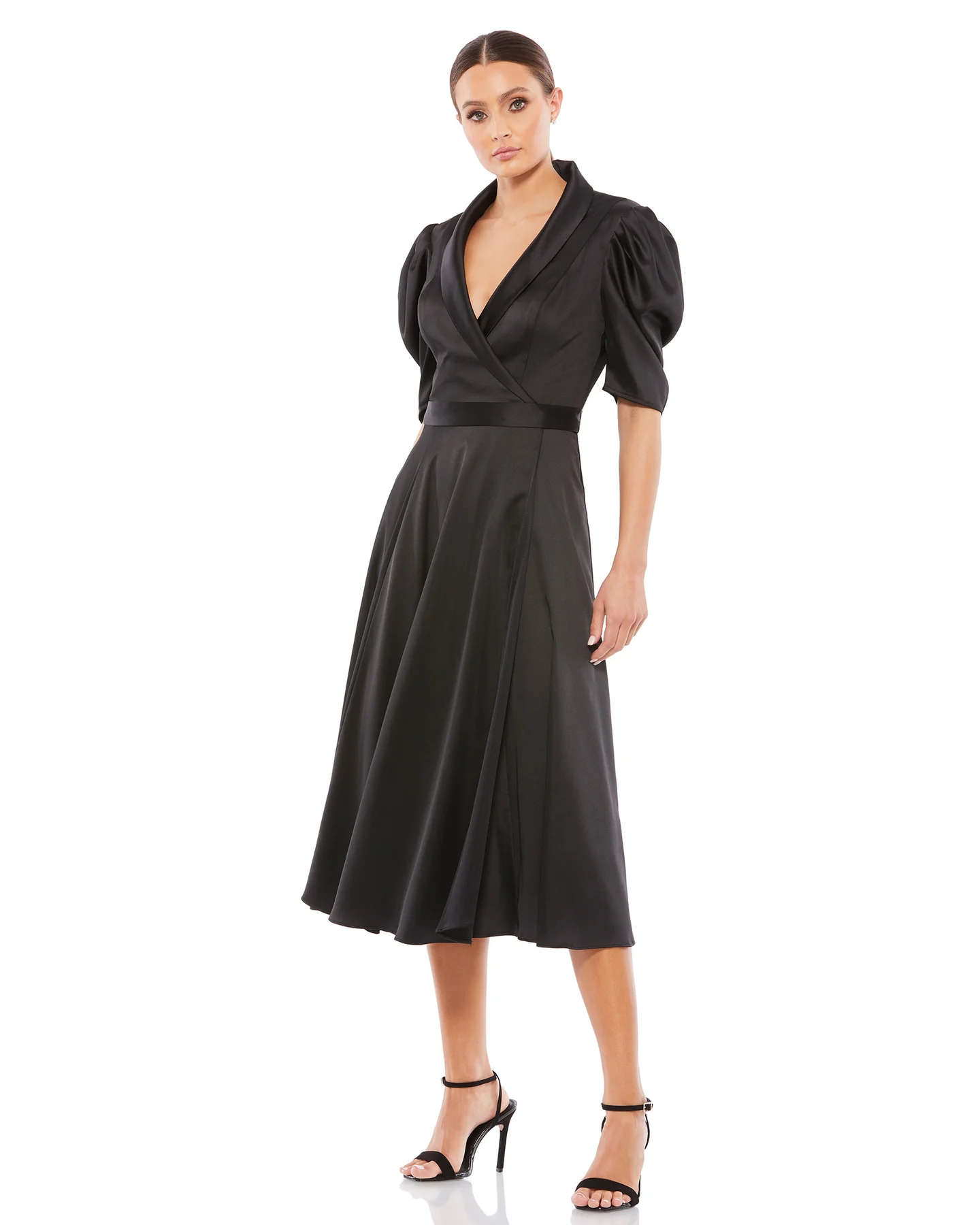 SATIN LAPEL PUFF SLEEVE TEA LENGTH DRESS