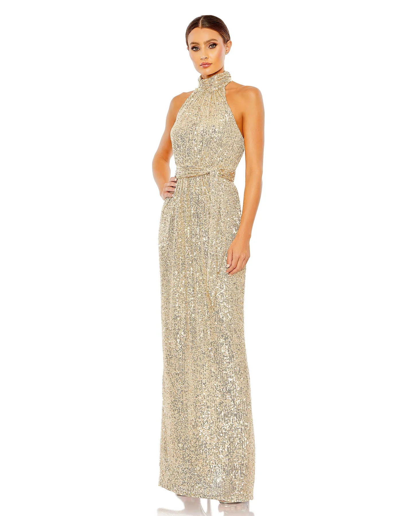 SEQUINED HALTER NECK BELTED SOFT TIE GOWN