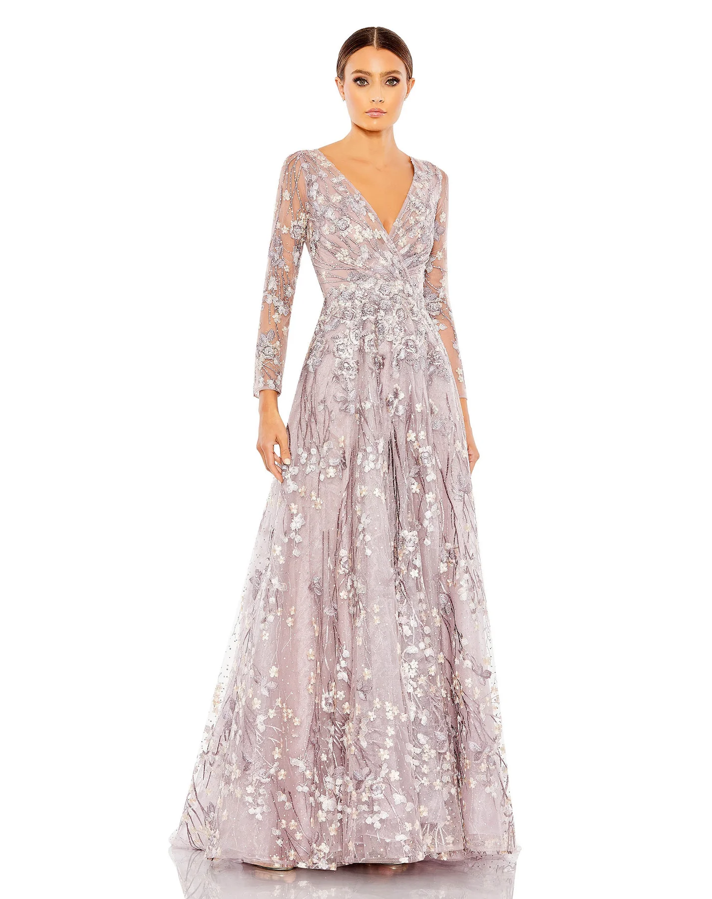 EMBELLISHED WRAP OVER ILLUSION LONG SLEEVE A LINE GOWN