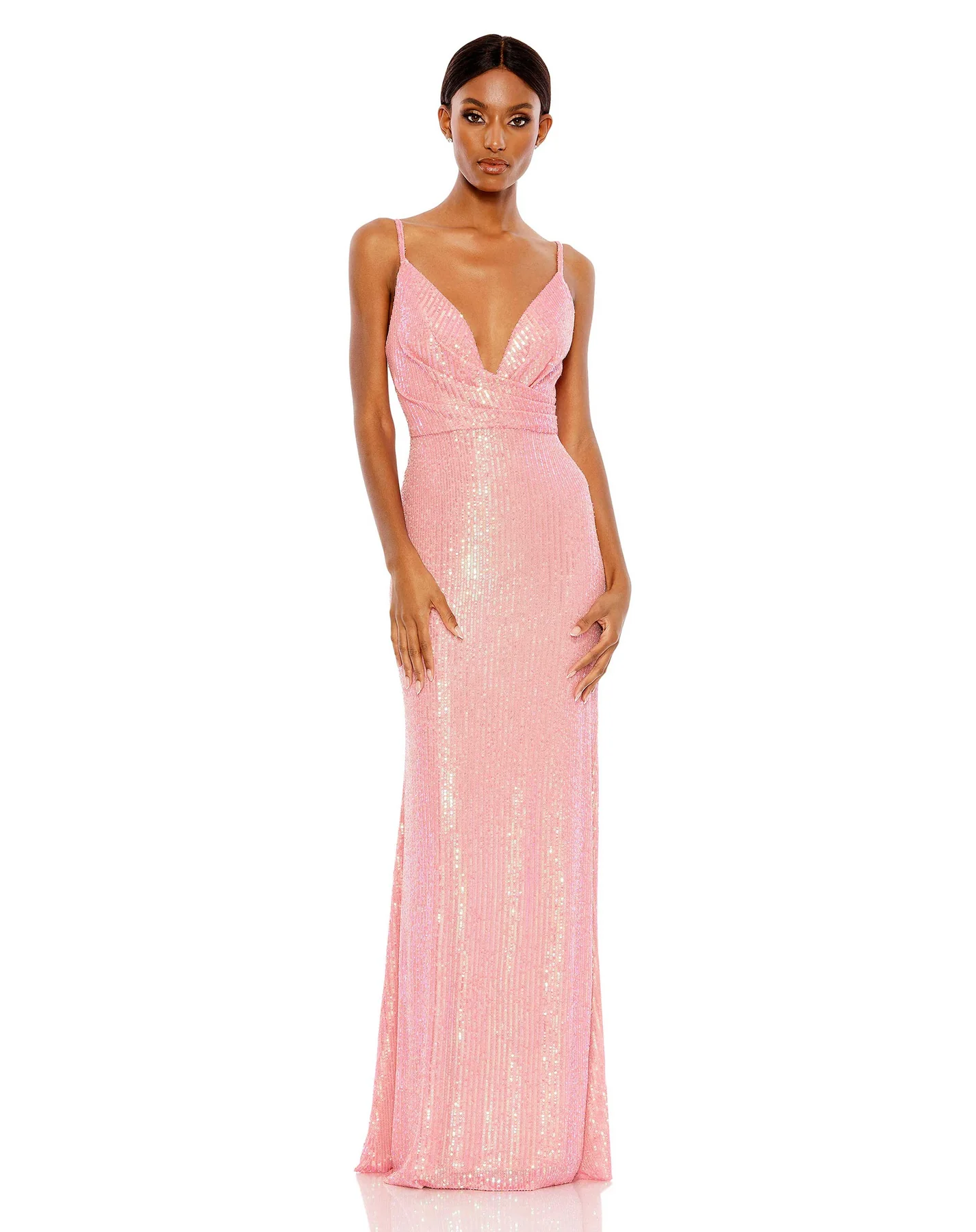 SEQUINED SCALLOP RUFFLE TIERED V-NECK GOWN