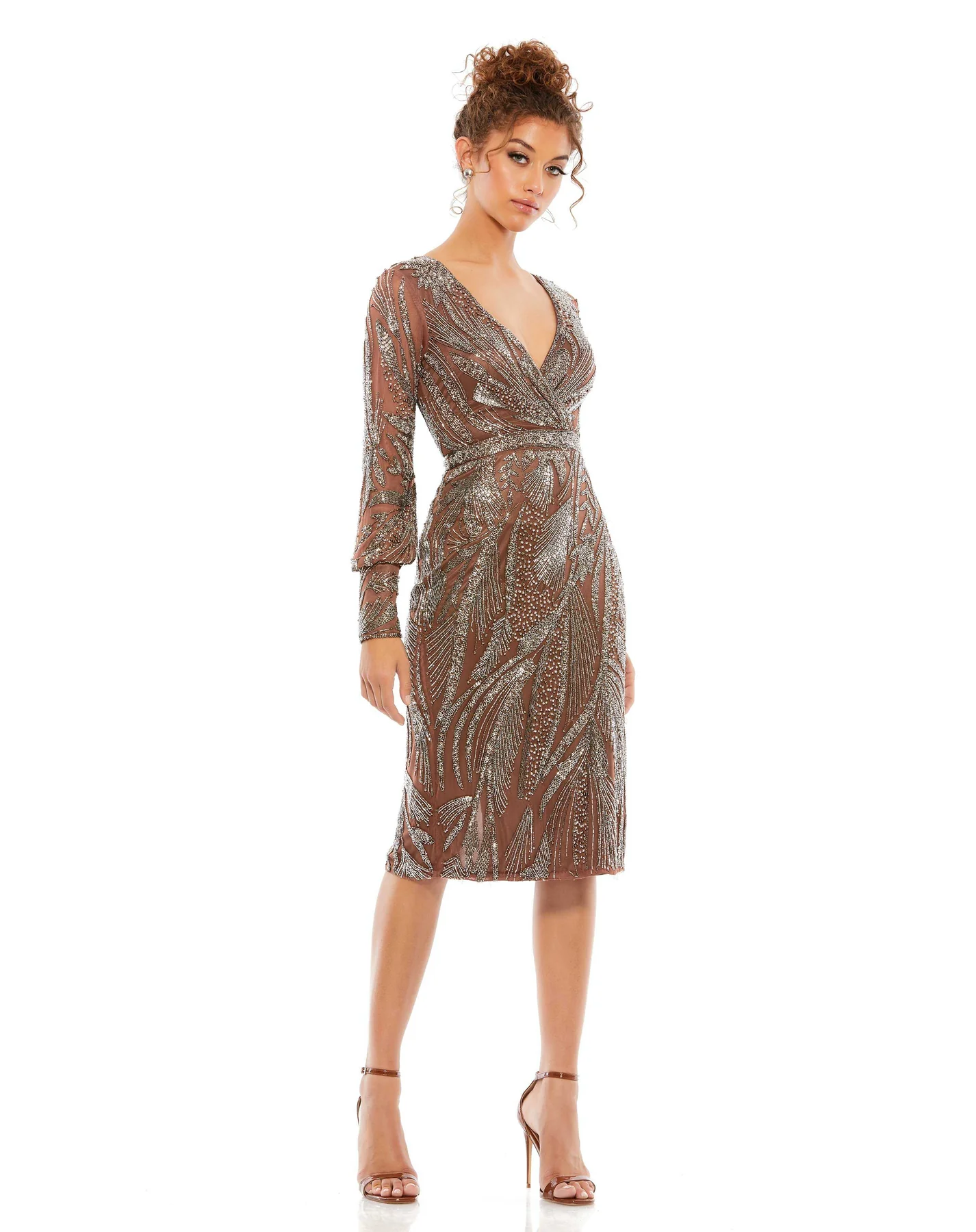 BEADED LONG SLEEVE WRAP OVER MIDI DRESS