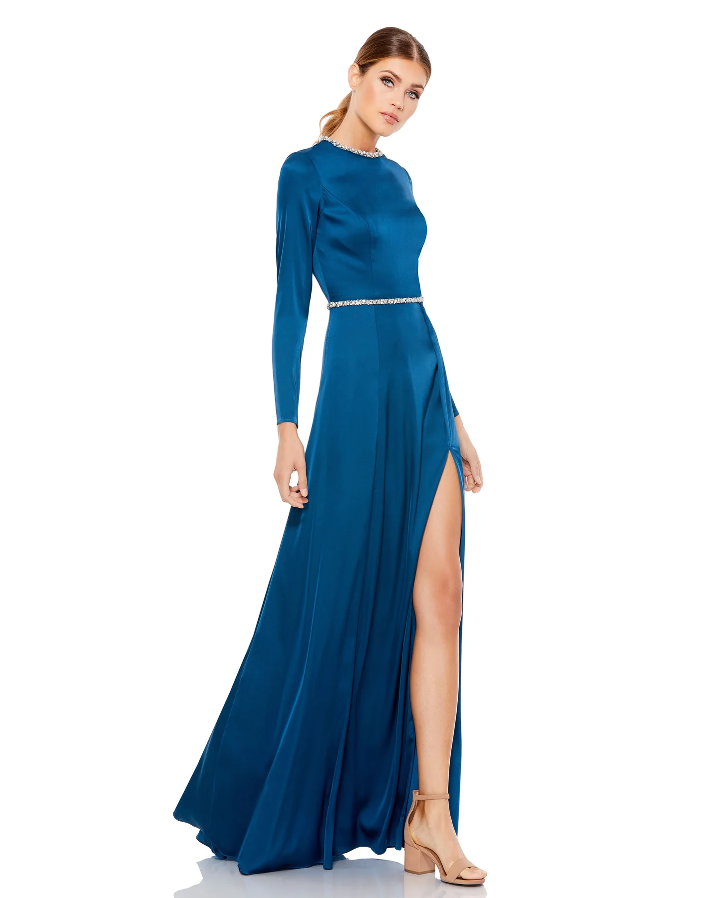 LONG SLEEVE JEWEL TRIMMED CHARMEUSE GOWN
