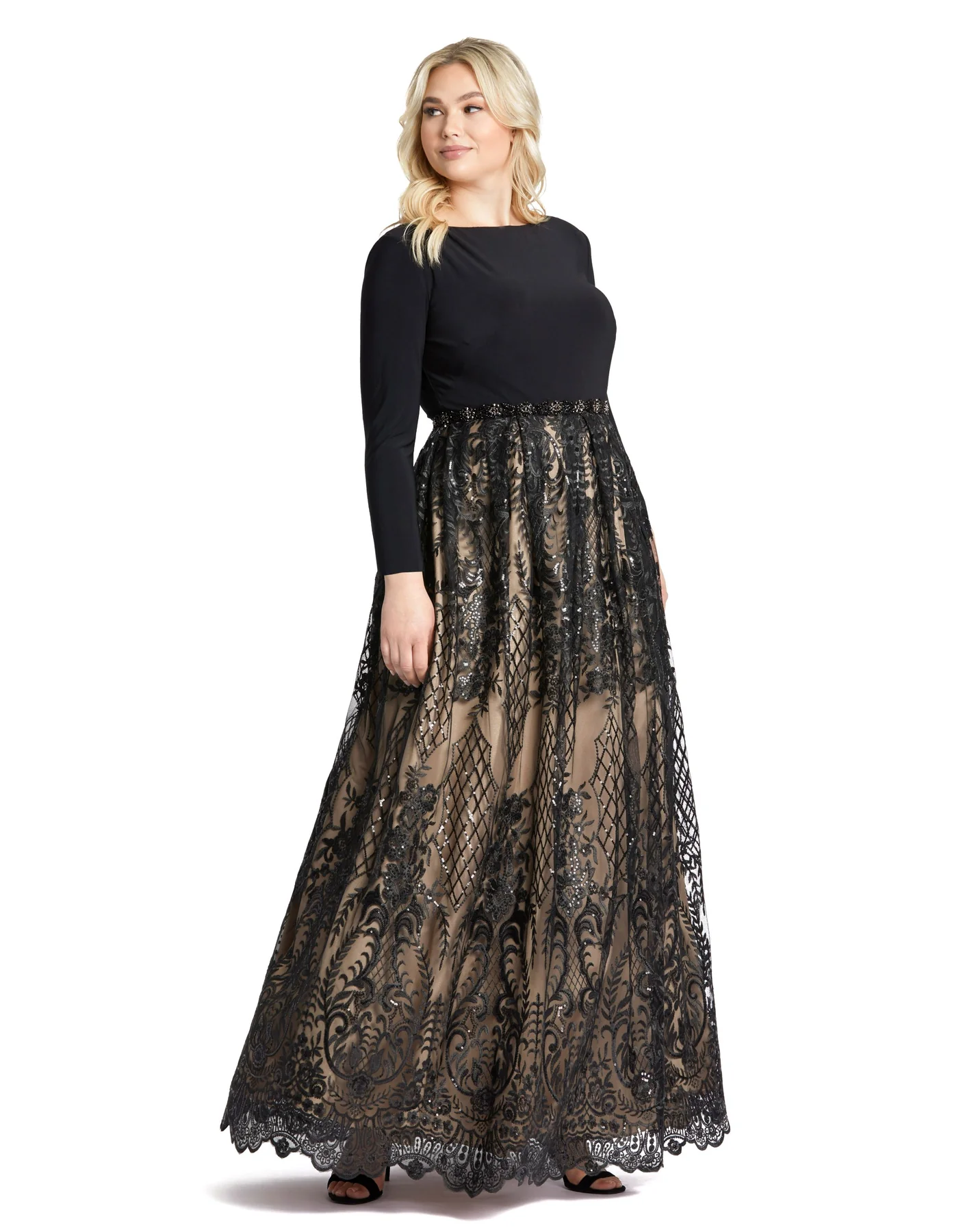 EMBELLISHED ILLUSION HIGH NECK LONG SLEEVE GOWN