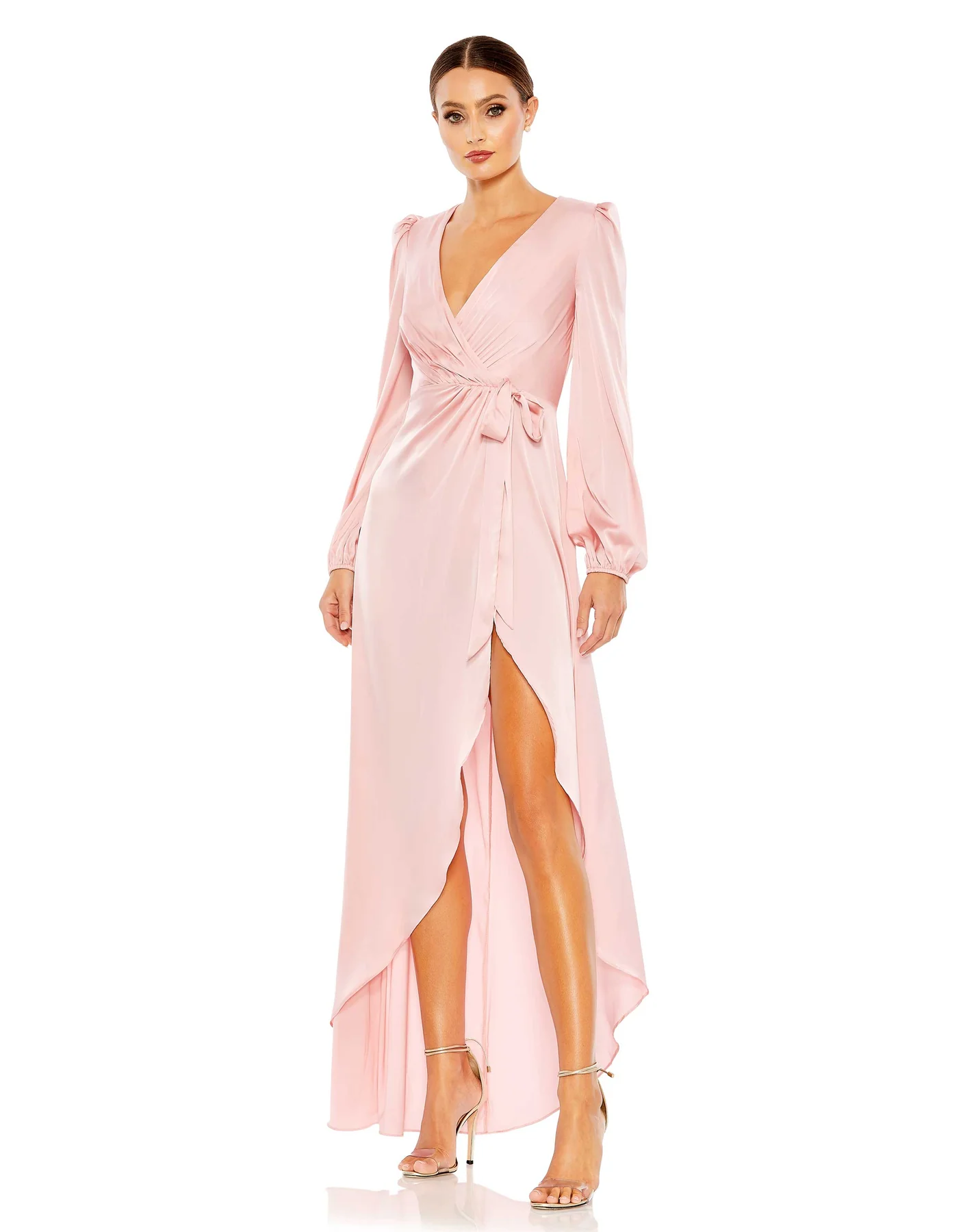 DRAPED FAUX WRAP PUFF LONG SLEEVE GOWN
