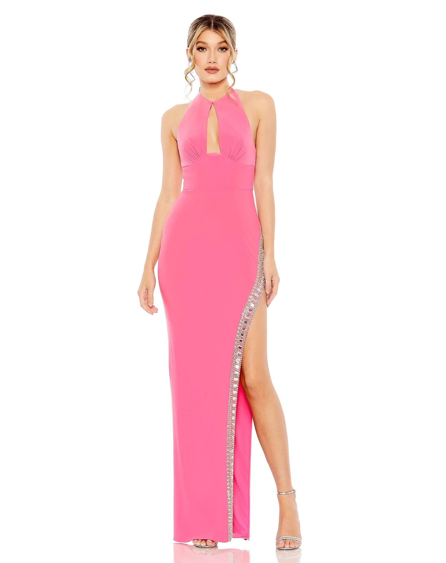 JERSEY HALTER NECK BEADED SLIT DETAIL GOWN