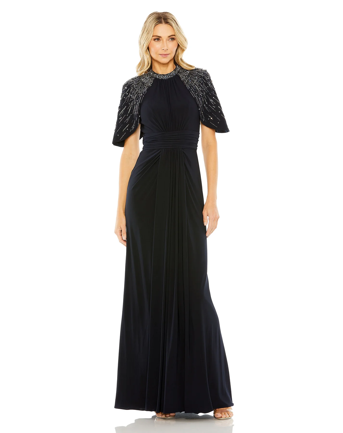EMBELLISHED COLUMN CAPE GOWN